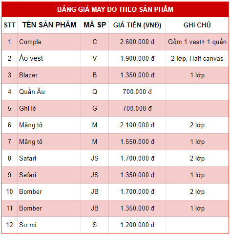 Tại Dunnio Duy Nguyễn, các sản phẩm may từ vải Tuytsi có mức giá tương đối như sau: