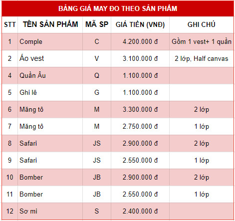 Tại Dunnio Duy Nguyễn, các sản phẩm may từ vải Tuytsi có mức giá tương đối như sau:
